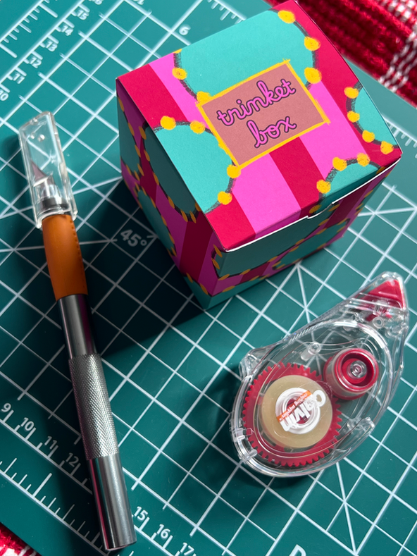 This project explores the intersection of vibrant surface design and functional packaging. Originally conceived as a solution for workspace organization, this trinket box features a high-contrast, "coquette-inspired" palette of magenta and teal, utilizing bold stripes and whimsical scalloped motifs.